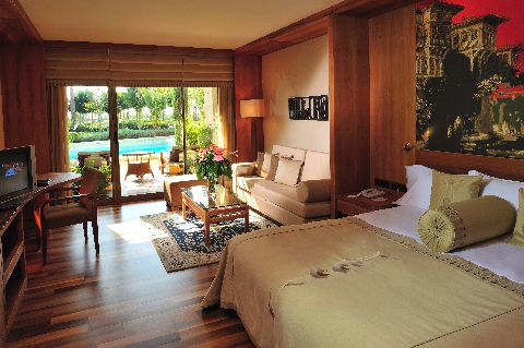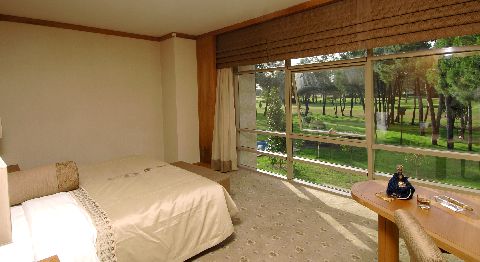Das Resort verfügt über 396 Zimmer (inkl. Suiten und Villen) und acht Restaurants, davon fünf à la carte Restaurants – „Aka“ – japanisch, „Serenity Steak House“, „Le Jardin au Printemps“ – französisch, „River Landing“ – Fisch und die italienische „La Trattoria Romana“. Hier findet man jeden Tag und für jeden Geschmack etwas (Reservierung bis zu 2 Tage im Voraus). Die beiden Restaurants „River Landing“ und „La Trattoria Romana“, sowie die Snack Restaurants „Traces Beach“ und „Route 66“ sind allerdings nur in der Sommersaison geöffnet. Die „Ella Fitzgerald Lobby Bar“ ist 24 Stunden geöffnet und alle lokalen Drinks sind „all inclusive“. Das „Serenity Spa“ bietet auf 3.500 m² alles was das Herz begehrt! Sauna, Dampfbad, Indoor-Pool und türkisches Bad. ExtraGolf & Reisen Tipp: Gönnen Sie sich eine Scheherazade Hamam Massage! Bei dieser traditionellen Behandlung/Massage können Sie sich richtig gut entspannen. Alle Zimmer des Gloria Serenity Resorts sind mit Sat-TV, Minibar, Safe, Dusche und Balkon ausgestattet. Jede Suite verfügt über ein Schlafzimmer mit einem großen Bett, ein Wohnzimmer mit Sitzgruppe, ein Badezimmer und eine große Terrasse mit Sonnendeck und einen großen Whirlpool. Der mit dem hoteleigenen Shuttle in nur 5 Minuten erreichbare Gloria Golfclub beheimatet zwei 18-Loch Championship Kurse (Old und New) und einen 9-Loch Akademie Platz, die alle von Architekt Michel Gayon gestaltet wurden. Zudem gibt es eine ausgezeichnete Übungsanlage mit zweistöckiger Driving Range, drei Chipping Grüns mit zwei Übungsbunkern und mehrere Putting Grüns.