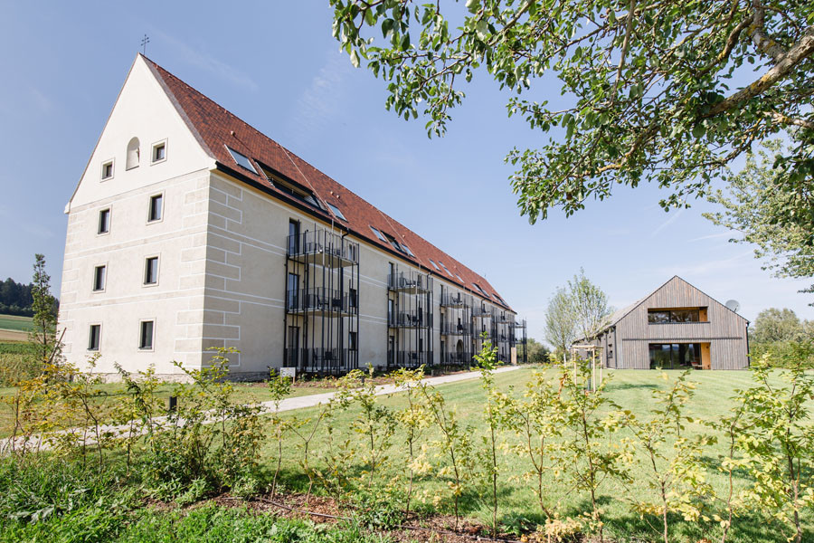 Der 320 Jahre alte Getreidespeicher wurde liebevoll restauriert und mit neuem Leben gefüllt. Ein Ensemble aus einem historischen Bauwerk, einem idyllischen Wohlfühlgarten, zwei modern ausgestattete Seminarräume sowie einem exklusiven Rooftop-Spa mit zwei Saunen und traumhaftem Ausblick. Ein Ort für alle, die Ruhe und Natur suchen und das Leben in vollen Zügen genießen wollen. Die äußere Gebäudehülle des ehemaligen Getreidespeichers blieb nahezu unverändert – im Inneren wurde alles neu: Auf drei Ebenen erwarten Sie 37 moderne Zimmer & Ferienapartments von 24–107 m². Genießen Sie die Schönheit der Natur in vollen Zügen und fühlen sich dabei wie zu Hause. Ästhetik trifft auf Langlebigkeit. Heimische Eichen dielen auf zeitgemäße technische Ausstattung. Fußboden- als auch Wandheizungen sorgen für modernen Komfort, der durch nachhaltige Energiegewinnung vor Ort sichergestellt wird. Zur Auswahl stehen Doppelzimmer ohne Balkon, Juniorsuiten mit oder ohne Balkon und Suiten mit Balkon. Die Energieversorgung wird mittels einer Holz-Hackschnitzel-Anlage gewährleistet, die in partnerschaftlicher Kooperation mit Landwirten der Umgebung betrieben wird. Erdwärme-Kollektoren und eine Wärmepumpenanlage tragen zur nachhaltigen Wärmeversorgung bei. Die Betonkernaktivierung ermöglicht effiziente Wärmespeicherung. Die großflächige PV-Anlage auf dem Dach trägt zur umweltbewussten Energieerzeugung bei und 8 E-Ladestationen stehen für die Gäste bereit.