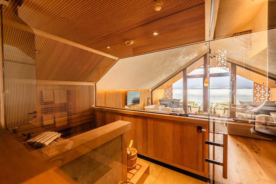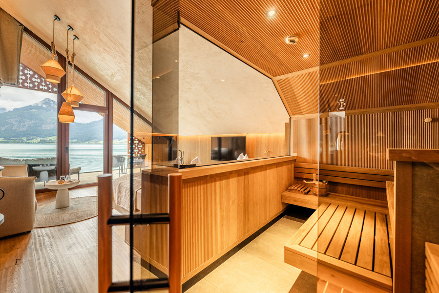 Hinzu kommen ein Rooftop Fitness & Yoga-Bereich, ein Massageraum mit Seeblick sowie ein Ruheraum mit Kamin, ein beheizter Outdoor-Infinity-Pool und ein Saunabereich mit Seezugang.