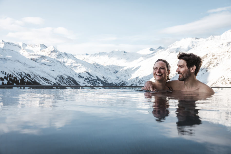 Nach einem Tag voller Sport – egal, ob Sie golfen oder Ski fahren – lädt der 2.000 m² große Wellnessbereich zum Abschalten ein. Genießen Sie eine wohltuende Massage, ent spannen Sie in den Saunen oder lassen Sie sich in einem der beiden Außenwhirlpools treiben und genießen Sie dabei den atemberaubenden Blick auf die verschneite Bergwelt.