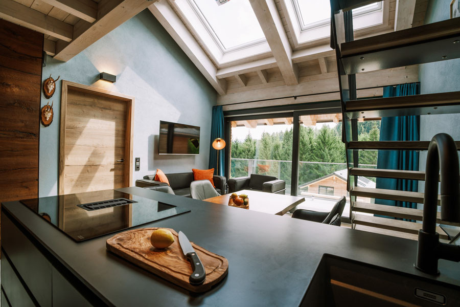 Zwischen den Runden sorgen der Spa-Bereich mit Pool, Sauna, Ice-Lounge und Medical Wellness für Entspannung. Wer es naturnah mag, taucht bei einer geführten Shinrin Yoku Session tief in die beruhigende Kraft des Waldes ein. 25 stilvolle Apartments und fünf luxuriöse Chalets mit bis zu 100 m² Wohnfläche, voll ausgestatteten Küchen und privater Atmosphäre, ermöglichen maximale Frei heit und Rückzug. Der Blick in den Wald gehört zur Ausstattung – ebenso wie feinste Materialien, Gaskamine in den Chalets und ein optionaler Butler-Service.