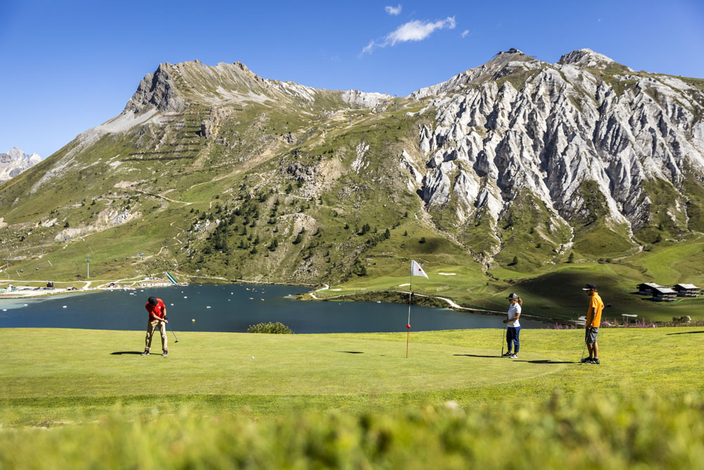 Der französische Wintersportort Tignes, rund 20 Autominuten von Vald‘Isère, bietet mit seinem 18-Loch Golfplatz auf 2100 Meter Seehöhe unterhalb des Grande-Motte-Gletschers die höchstgelegene Golfanlage in Europa. Der Farbkontrast zwischen dem Grün des Golfplatzes, dem Blau des Tignes-Sees und dem Weiß der Gletscher ist beeindruckend und das Golfen auf diesem Parcours ein einzigartiges Erlebnis. Dementsprechend kurz sind die Öffnungszeiten des Golf Du Lac de Tignes (Greenfee € 69) von Ende Juni bis ca. Anfang September. Auf dem scherzhaft bezeichneten „Murmeltier-Parcours“ dürfen Sie Ihren Ball nicht aus den Augen lassen, sonst verschwindet er in einem der vielen Löcher, die rund um die Fairways zu sehen sind.