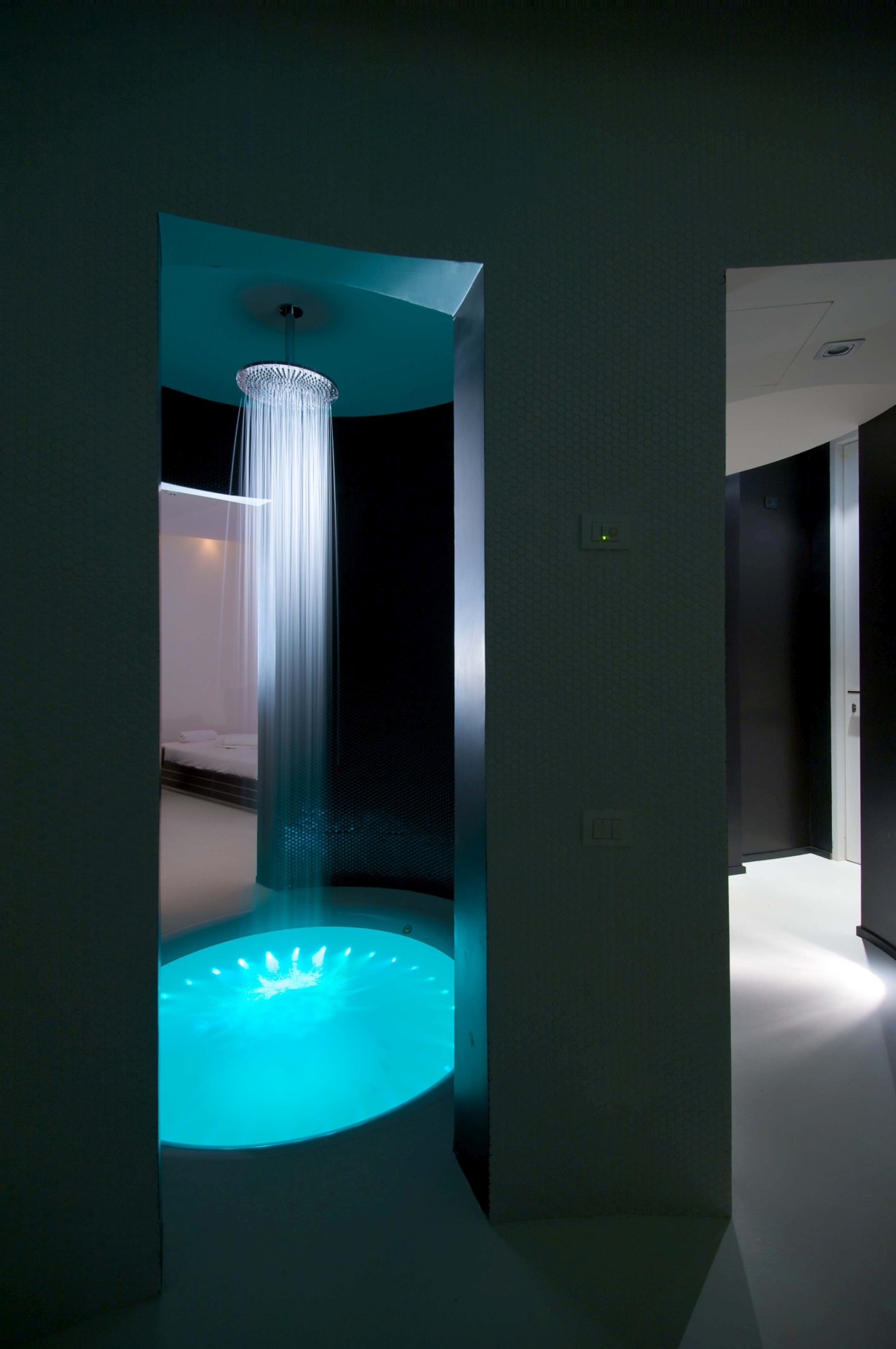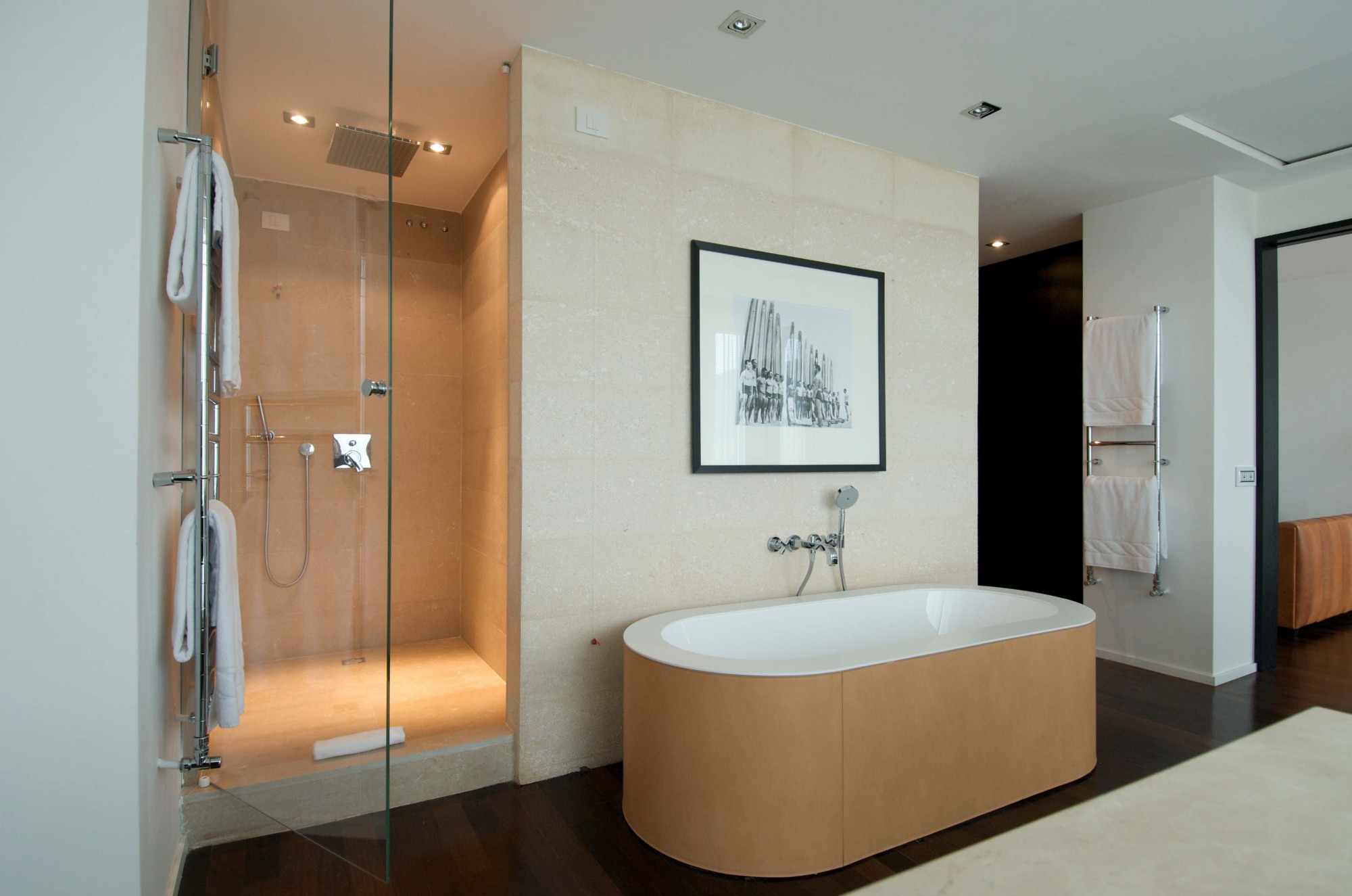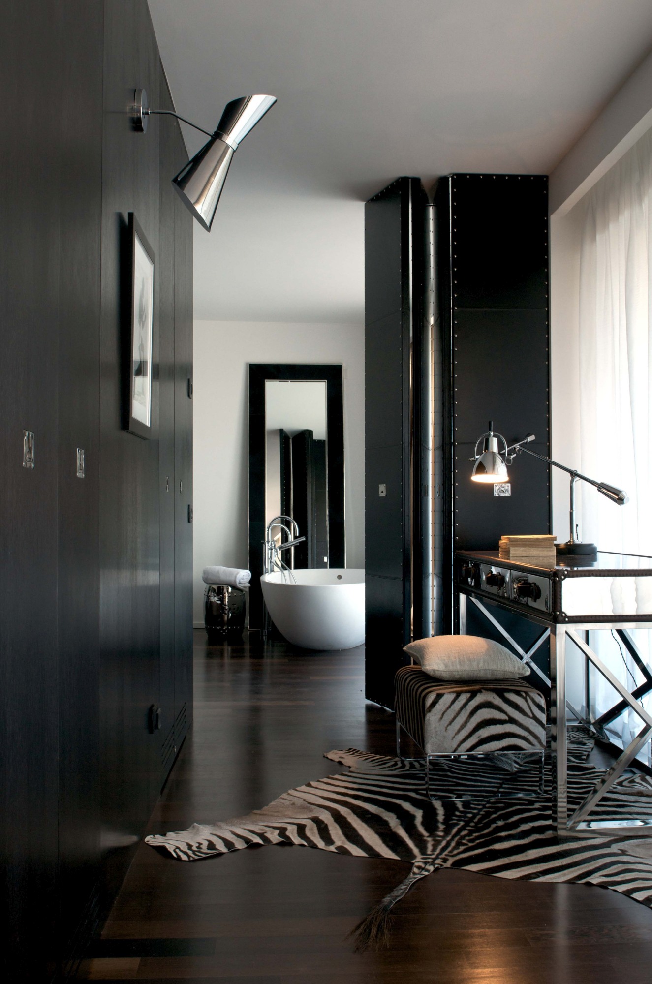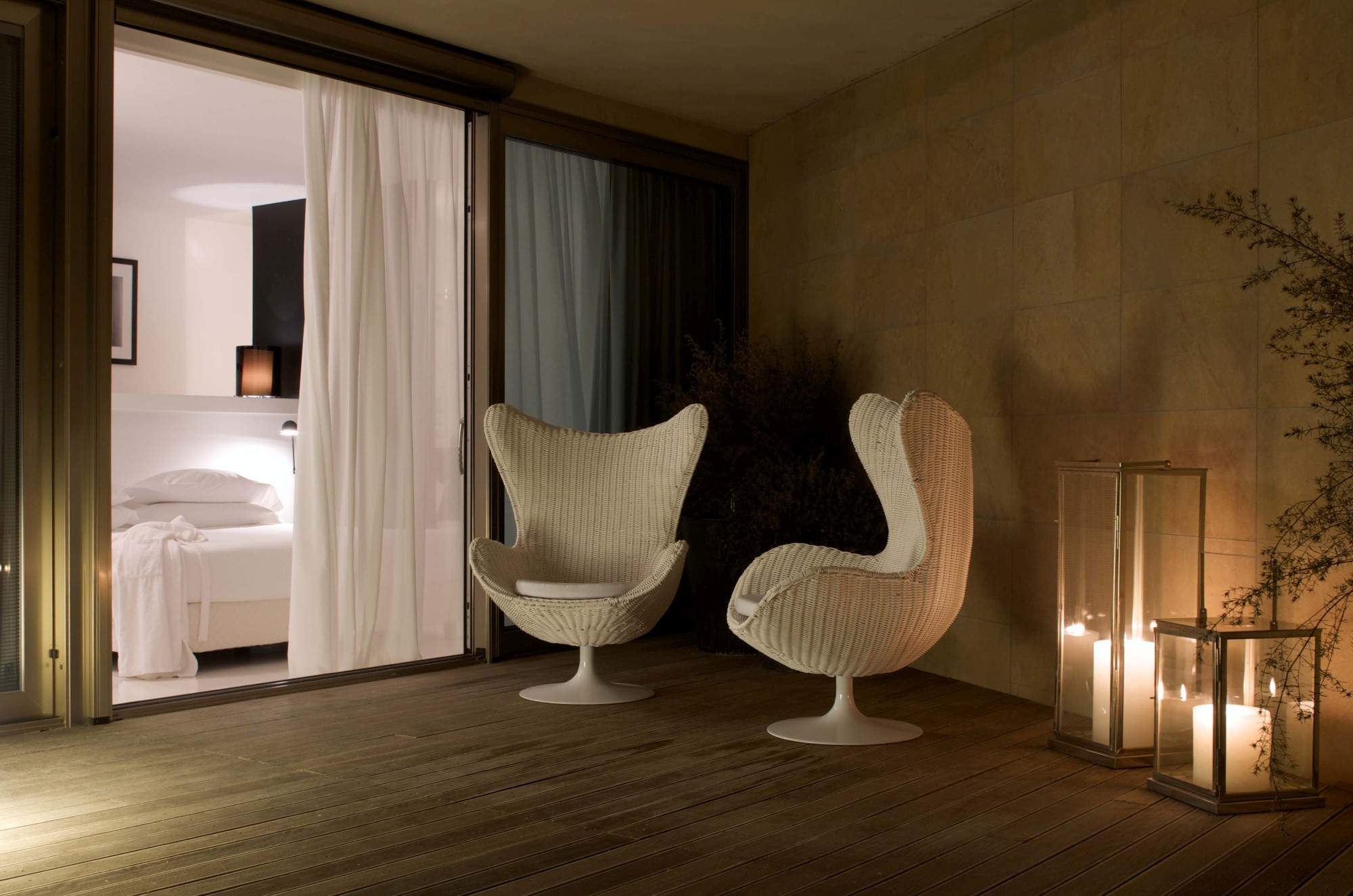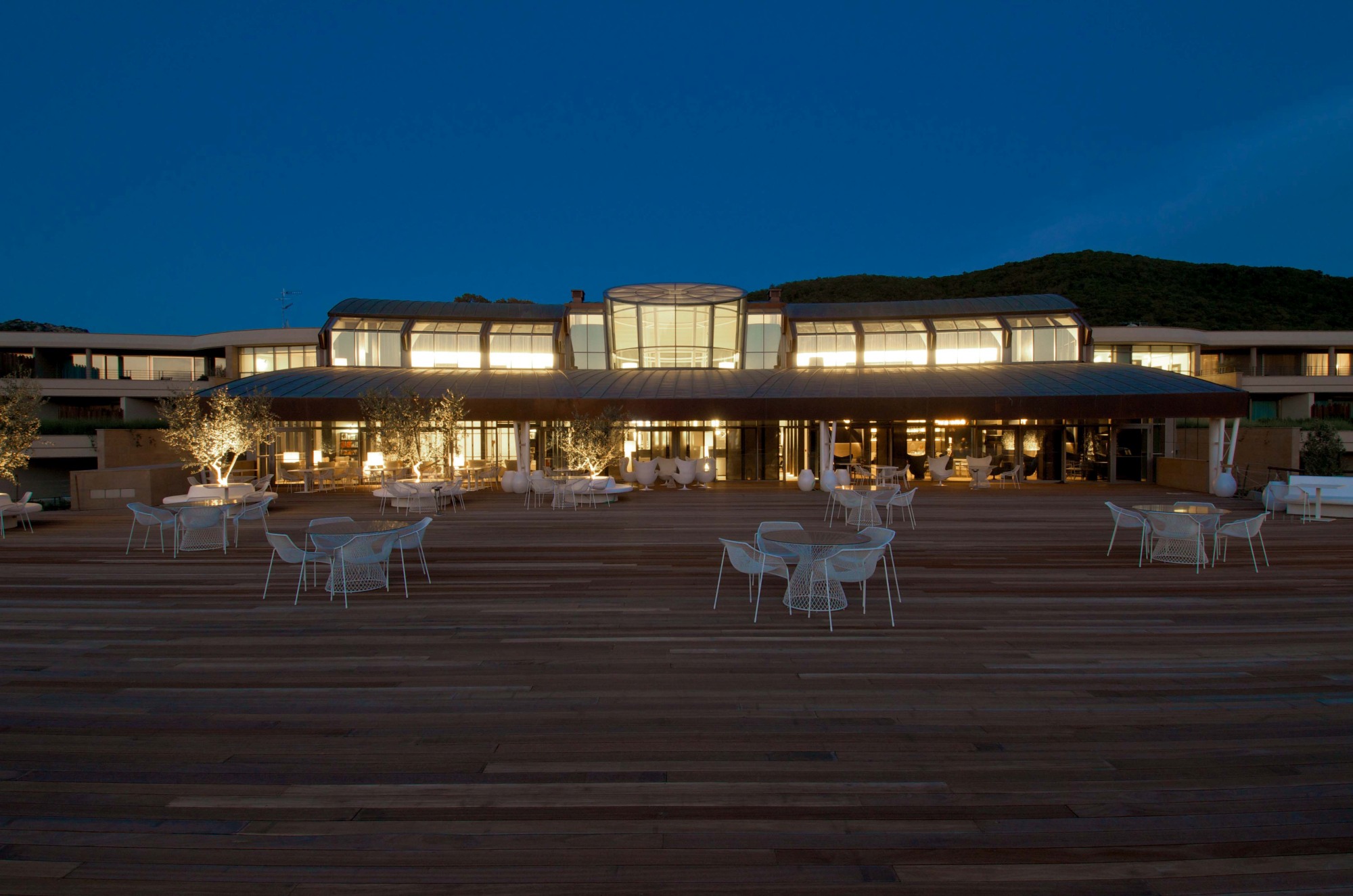 Auf dem 77 Hektar großen Gelände des Golfplatzes wurde ein 5 Sterne Hotel eröffnet, das 66 Junior Suiten, jeweils mit eigener Terrasse, umfasst und an Komfort und der neuesten Technologie keine Wünsche offen lassen. Sie sind auf drei Ebenen verteilt, die sich durch ihre verschiedenen Stile unterscheiden. In der dritten Etage befinden sich die Club Junior Suiten, die den glamourösen Geist des Resorts wiedergeben. Dunkles Holz, Wannen aus Tabarkastein in der Mitte des Zimmers, während auf der 2. Ebene in den Tuscany Junior Suiten das ländliche Leben gefiltert und auf den nordeuropäischen Geschmack abgestimmt wurde. Die vorwiegend schwarzen Möbel stehen im Kontrast zum Eichenholzboden, der taubenblauen Täfelung und der großen Wanne aus anthrazitfarbenem Stein. Die Gallery Junior Suiten befinden sich auf der ersten Ebene und haben direkten Zugang zum Außenpool. Schon im Flur des Stockwerks, der wie eine Bildergalerie wirkt, wird die Absicht klar: harzweiß, optische Kontraste, Möbel im Vintage-Stil und zeitgenössische Fotografien sind die Antwort des Argentario Golf Resort & Spa auf die einheitliche Konzeption der Anlage.